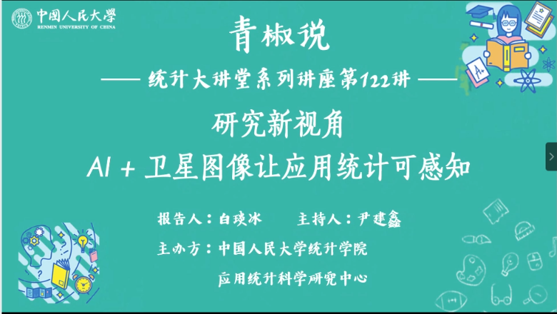 2020-06-226月19日下午,“统计大讲堂”第一百二十二讲——“青椒说”系列讲座第三期如期举行。讲座以“研究新视角:AI+卫星图像让应用统计可感知”为主题,由统计学院讲师白琰冰主讲。此次讲座为线上讲座,众多师生通过腾讯会议参与研讨。统计学院老师、中心研究员李扬、肖争艳、高光远参加讲座。统计学院副院长尹建鑫主持本次讲座。